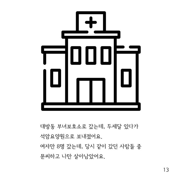 사진 13] 대방동 부녀보호소로 갔는데, 두세달 있다가 석암요양원으로 보내졌어요. 여자만 8명 갔는데, 당시 같이 갔던 사람들 중 문 씨하고 나만 살아남았어요.