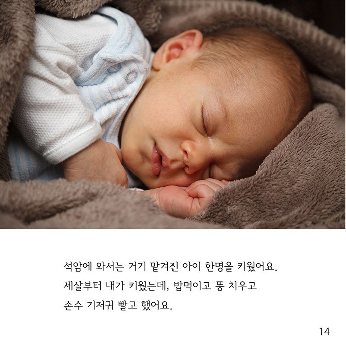 사진 14] 석암에 와서는 거기 맡겨진 아이 한명을 키웠어요. 세 살부터 내가 키웠는데, 밥 먹이고 똥 치우고 손수 기저귀 빨고 했어요.