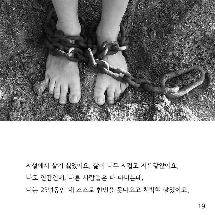 사진 19] 시설에서 살기 싫었어요. 삶이 너무 지겹고 지옥 같았어요. 나도 인간인데 사람들은 다 다니는데 나는 23년 동안 내 스스로 한번을 못 나오고 처박혀 살았어요.