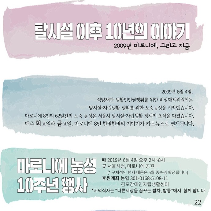 2009년 6월 4일, ‘석암재단 생활인 인권쟁취를 위한 비상대책위원회’는 서울 종로구 마로니에공원에서 탈시설-자립생활 쟁취를 위한 노숙농성을 시작했습니다. 당시 시설을 나와 농성투쟁을 했던 8명은 이후 ‘마로니에 8인’이라고 불렸습니다. 이들 62일간의 노숙 농성은 서울시 탈시설-자립생활 정책의 초석이 되었는데요, 석암투쟁 10주년을 맞아 ‘마로니에 8인 - 탈시설 이후 10년의 이야기’가 카드뉴스로 연재됩니다. (제작 : 전국장애인차별철폐연대)