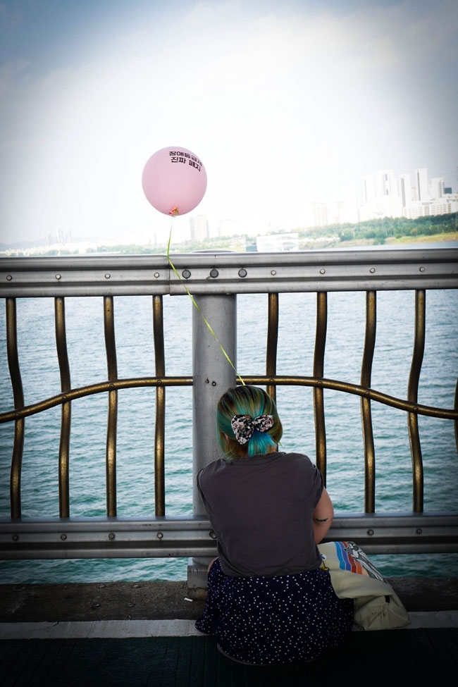 장애인들이 한강 다리를 건너고 있습니다.