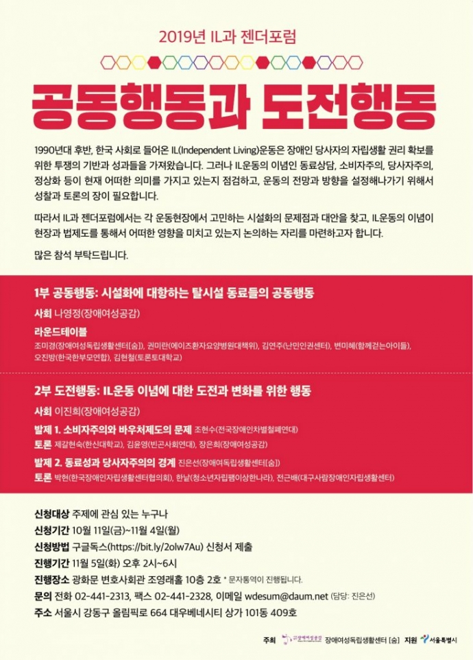 장애여성독립생활센터[숨]은 ‘공동행동과 도전행동’을 주제로 2019년 IL(Independent Living)과 젠더포럼을 오는 5일 오후 2시부터 광화문 변호사회관 조영래홀 10층 2호에서 개최한다.