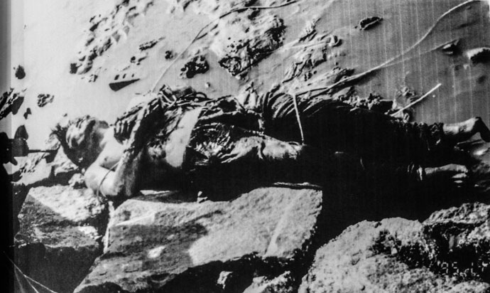 그는 상의와 신발이 벗겨진 채 물속에 엎어져 있었으며, 뒷모습은 죄수를 호송할 때 양 손목과 양팔을 함께 묶는 방법으로 포박당한 상태였다. 시신을 뒤집어 똑바로 눕히자 양 손목에는 밧줄이 느슨히 묶여 있었다. 얼굴과 뒷머리, 양쪽 어깨, 팔 등에는 상처와 피멍이 수두룩하였고, 두 눈은 부릅뜨고 있었다. 시신의 손목에 포박된 줄은 노점상이 천막을 고정하기 위해 사용하는 약 10mm 두께의 줄로써, 어통소 초소와 철망 주변에 흔히 널려 있는 것이었다.