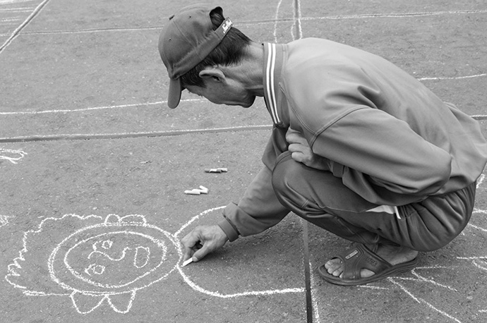 어떤 이가 나무 옆에 앉아 밥을 먹는다. 비둘기들이 옆에서 나란히 식사한다. 나뭇잎 덕분에 햇빛과 그늘이 교차하는 얼룩덜룩한 배경이 펼쳐졌다. 길에서, 그것도 혼자서 먹는 밥 한 끼의 의미가 가벼워 보이진 않다. ‘무거워 보인다’라는 것이 더 어울리는 거 같다. 하지만 비둘기가 있고 비둘기를 쫓아낼 생각도 없는 점심 한 끼는 최소한 심각해 보이지는 않는다. 부자나 빈자나 모두 한 끼의 점심을 먹는다. 식단의 차이가 있겠으나 밥의 의미엔 차이가 없다.