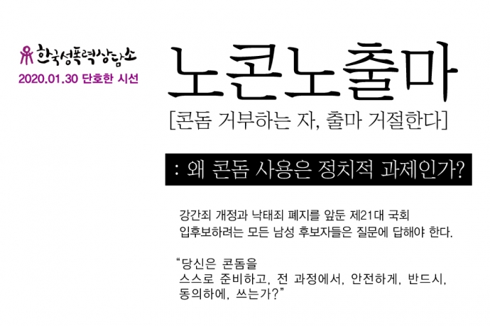 한국성폭력상담소는 30일, 제21대 국회에 입후보하려는 모든 남성 후보자들에게 ‘콘돔 거부하는 자, 출마 거절한다’라는 뜻의 이른바 ‘노콘노출마’를 요구하는 입장을 밝혔다.