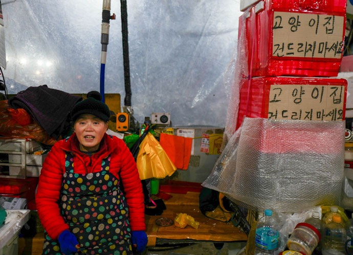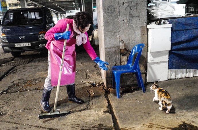 지나가는 길고양이를 보면 가슴 한쪽이 철렁 내려앉을 것이지만, 삶의 터전마저 포기하기란 쉽지 않았다. 상인들은 부서진 집기를 챙기고, 물건을 주워 모았다. 천막을 지탱하는 밧줄을 단단히 치고, 어묵을 데우는 가스에 불을 켰다.