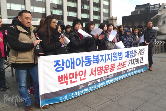전국장애인부모연대(아래 부모연대)는 16일 이른 11시 전국 각 지역에서 ‘장애아동복지지원법 제정을 위한 백만인 서명운동 선포 기자회견’을 열었다 . 이날 기자회견은 서울, 부산, 대전, 광주, 울산, 경기, 경남, 충북, 전북 등 전국에서 동시에 진행됐다.