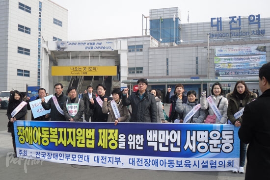 ![]() ▲대전역 앞에서 열린 장애아동복지지원법 제정 촉구 기자회견.ⓒ전국장애인부모연대 |
