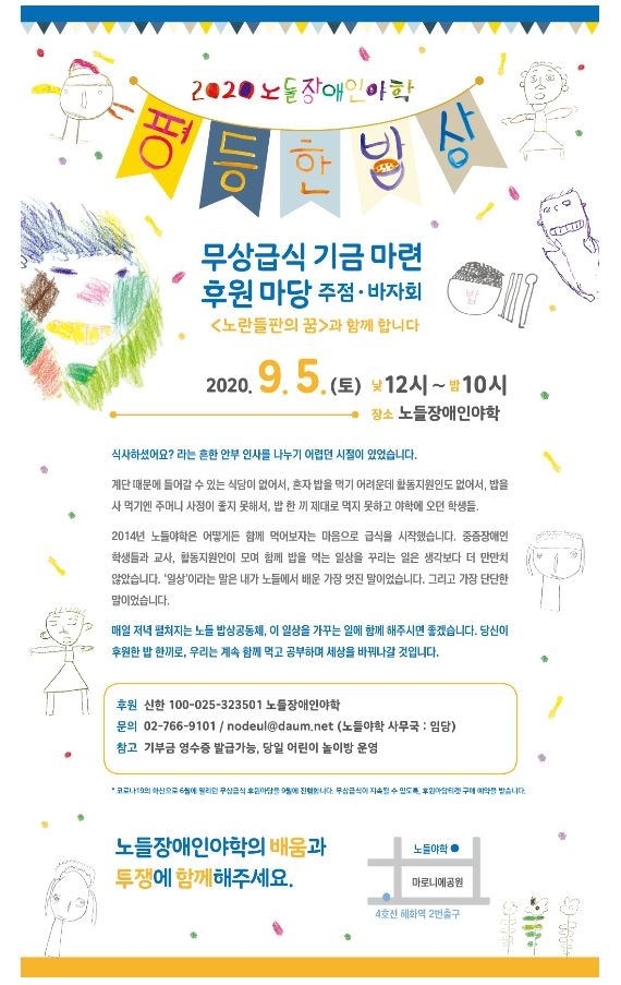 노들장애인야학(아래 노들야학)이 오는 9월 5일 정오 12시부터 오후 10시까지 무상급식 기금 마련을 위한 후원마당을 연다.