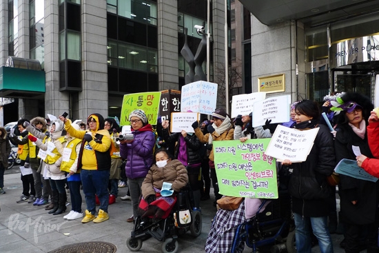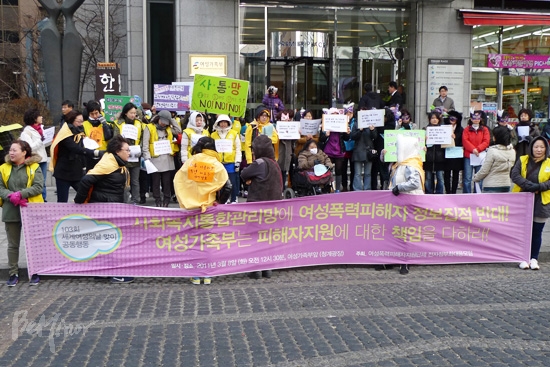 8일 정오, 휘몰아치는 칼바람 속에서 여성단체들이 여성가족부 앞에 모였다. 장애여성공감 성폭력상담소, 반성매매인권행동 이룸, 한국여성민우회 성폭력상담소 등 8개의 여성단체가 모여 만든 ‘여성폭력피해자지원시설 전자정부화대응모임’(아래 전자정부화대응모임)은 ‘세계여성의날’을 맞아 여성가족부 등 정부의 책임을 묻기 위해 모였다.