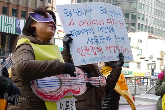 ![]() ▲피해자의 인권침해보다 효율성만을 중시하는 전자정부를 풍자하는 노래를 참가자들이 부르고 있다. |