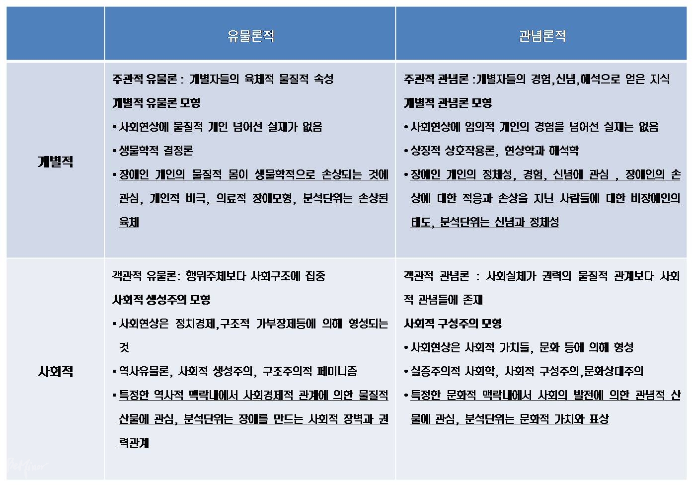우리가 앞으로 공부할 ‘사회적 장애이론’은 표 아래 부분 왼쪽에 있는 ‘사회적 생성주의 모형’이다. 그러므로 엄밀히 말하자면 그냥 ‘사회적 장애이론’이라고만은 해서는 안 되고 ‘사회적 생성주의 모형에 기초한 사회적 장애이론’이라고 해야한다. 하지만 일단 우리끼리의 약속으로 ‘사회적 장애이론’이라고 명명하고 가기로 하자.