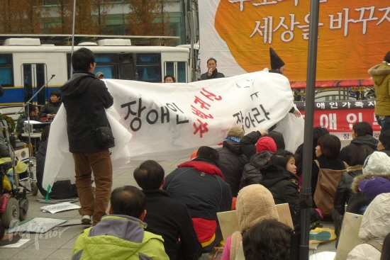 ![]() ▲장애를 어떤 관점으로 바라보느냐에 따라 영국의 장애학자 프리스틀리는 장애이론을 4가지로 유형화시켰다. 사진은 2009년 7월, 탈시설 자립생활을 위한 주거권 확립을 위해 서울시청앞에 모인 모습. 당시오세훈 서울시장 면담을 요청했으나 받으들여지지 않았다. |