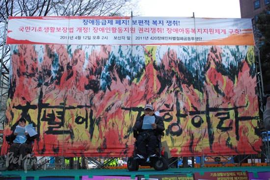 420공투단은 12일 늦은 3시 종로 보신각에서 300여 명이 참가한 가운데 ‘420장애인차별철폐 농성투쟁선포 전국결의대회’를 열고 장애등급제 폐지, 국민기초생활보장법 개정, 장애인활동지원법 개정, 장애아동복지지원법 제정 등 보편적 권리를 쟁취하기 위한 농성에 돌입했다.