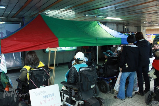학생인권조례제정 서울본부 다영 활동가는 “서명운동을 위해 가판대를 들고 이동을 하면서 엘리베이터가 없는 역, 계단이 있는 버스 때문에 이동이 어려워 장애인 이동권을 떠올리게 되었다”라면서 “장애인이 제대로 이용할 수 없는 교통수단에 대중교통이라는 말을 붙이는 게 이해하기 어렵다”라고 지적했다.