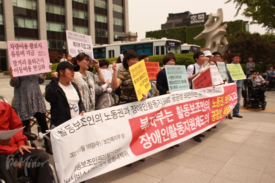 사회서비스시장화저지를 위한 공동대책위원회와 활동보조인권리찾기모임은 18일 이른 11시 40여 명이 모인 가운데 보건복지부 앞에서 ‘활동보조인의 노동권과 장애인활동지원서비스 공공성 외면하는 복지부 규탄 기자회견’을 열었다.