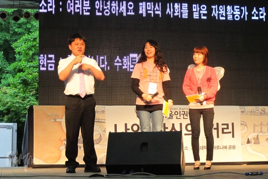 ![]() ▲열다섯 번째 서울인권영화제 폐막식이 22일 늦은 6시 대학로 마로니에 공원에서 열렸다. 사회를 맡은 소라, 현금 자원활동가. |