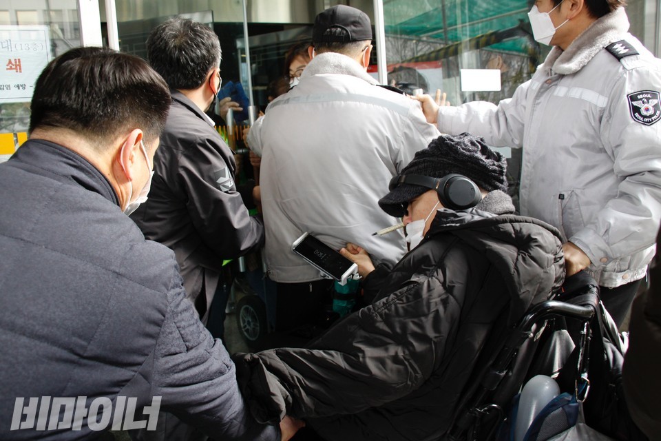 휠체어를 이용하는 활동가가 서울시청 별관 입구에 진입하려 하자, 서울시청 직원으로 추정되는 사람들과 경찰들이 휠체어를 잡고 진입을 막고 있다.