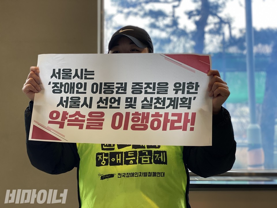 한 활동가가 “서울시는 ‘장애인 이동권 증진을 위한 서울시 선언 및 실천계획’ 약속을 이행하라!”라고 적힌 피켓을 들고 있다.
