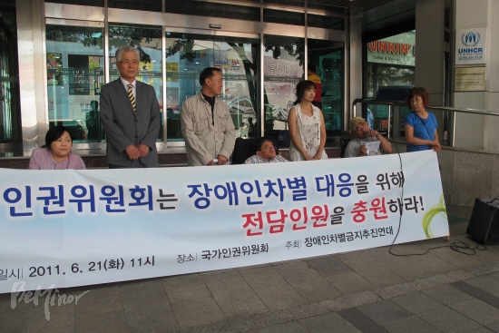 장애인차별금지추진연대(아래 장추련)가 21일 이른 11시 국가인권위원회(위원장 현병철, 아래 인권위) 앞에서 기자회견을 열고 인권위에 장애인차별 대응을 위한 장애인 전담인원 충원을 촉구했다.