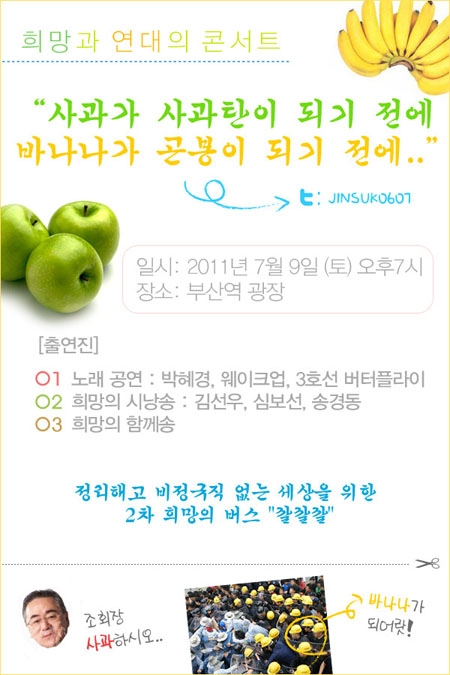 ![]() ▲9일 늦은 7시 부산역 광장에서 '희망과 연대의 콘서트- 사과가 사과탄이 되기 전에, 바나나가 곤봉이 되기 전에...'가 열린다. |