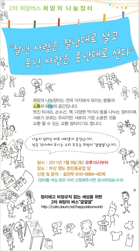 ![]() ▲9일 늦은 10시에는 한진중공업 앞에서 '희망의 나눔장터 - 잘난 사람은 잘난대로 살고 못난 사람은 못난대로 산다'가 열릴 예정. |