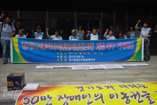 에바다장애인자립생활센터 홍석준 사무국장은 기자회견문을 통해 "이번 도의회 기간에 '경기도교통약자이동편의증진조례'가 개정되어 실질적으로 장애인의 이동권이 보장될 수 있도록 김문수 지사와 도의원들이 적극적으로 그 책임을 다할 것을 촉구한다"라면서 "경기도의회에서 장애인이동권을 보장하는 조례개정과 예산 책정을 더는 미루지 마라"라고 요구했다.