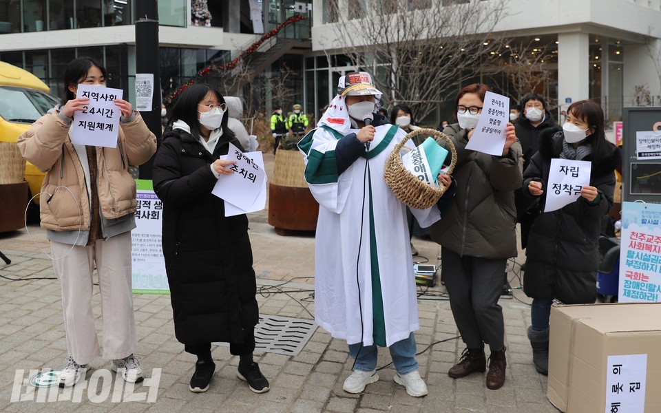 “하느님의 자녀 3만 명이 전국 각지의 시설에 갇혀 소외와 불평등으로 고통받고 있습니다. 예수 그리스도께서 바라는 세상은 장애라는 이유로 작은 방에 가둬진 채 삶의 종말을 기다리는 게 아닙니다. 탈시설 권리를 지키러 이 땅에 찾아오신 주님, 천주교가 탈시설에 반대한 걸 부끄러워하며 장애인과 가난한 사람, 목소리를 잃은 이들과 함께하게 하소서.” (다니주누 전장연 활동가)