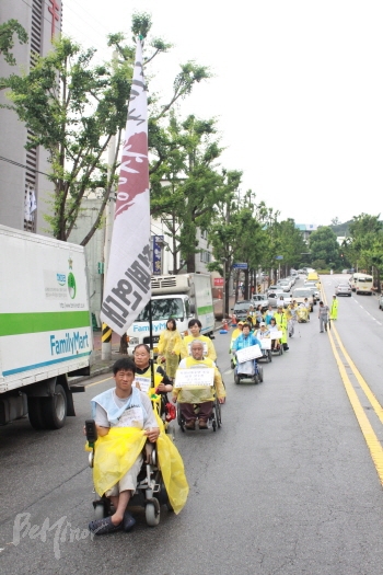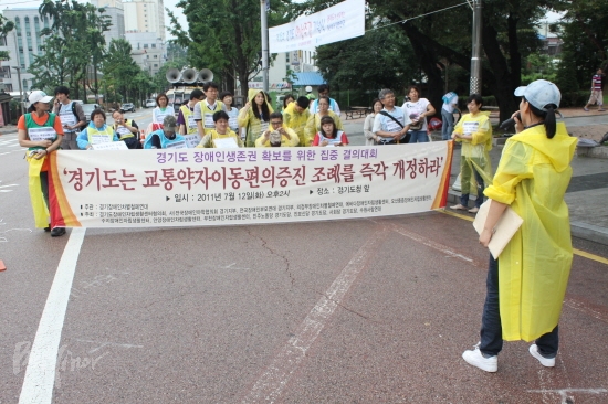 경기장차연은 경기도의회에서 수원역 광장까지 행진한 뒤 천막을 치고 교통약자이동편의증진조례 개정을 요구하며 농성에 들어갔다.