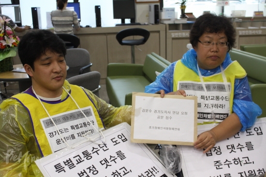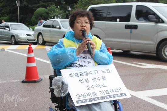 이날 기자회견에서 경기장차연 이형숙 상임대표는 “경기도청내의 동물원에서 키우는 닭에게도 예산이 있는데 장애인 이동권을 위한 예산은 없다”라며 “시군의 특별교통수단 도입과 운영에 대해 경기도의 예산지원을 촉구한다”라고 목소리를 높였다.