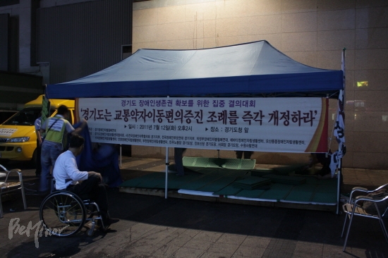 경기장애인차별철폐연대(상임대표 이형숙, 아래 경기장차연)는 12일 경기도의회를 상대로 ‘교통약자이동편의증진조례’의 개정을 요구하며 기자회견을 열고 수원역 광장에서 천막농성을 시작했다.