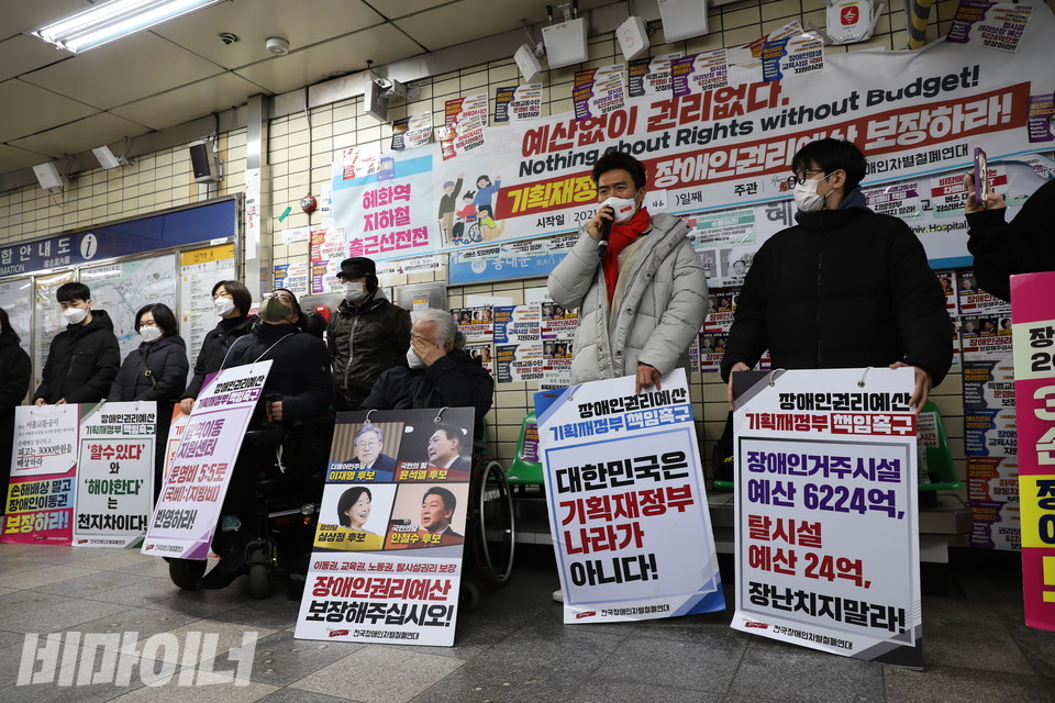 전국장애인차별철폐연대(아래 전장연)가 기획재정부에 장애인 권리예산 보장을 촉구하며 10일, 혜화역 승강장(동대문 방면)에서 46일 차 아침 선전전을 하고 있다.