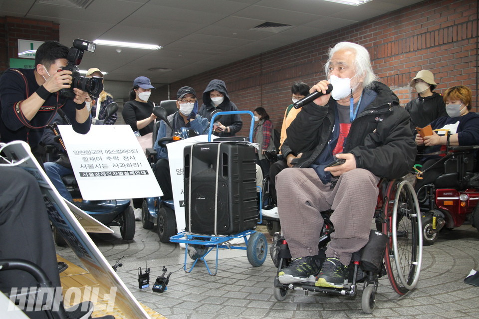 박경석 전장연 상임공동대표는 분노에 찬 목소리로 서울시를 규탄했다. 박 대표는 “에스컬레이터에서 휠체어 탄 장애인이 떨어져 죽은 것은 이번이 처음이 아니다. 서울교통공사가 관할하는 대부분의 지하철역 에스컬레이터에는 장애인 휠체어나 스쿠터가 들어가지 못 하도록 차단봉을 세웠다. 이미 서울시는 장애인이 에스컬레이터에 타는 위험에 대해 알고 있는 것”이라며 “그런데 차단봉 설치가 의무사항이 아니라 권고사항이라는 이유로 서울시는 관리책임을 소홀히 했고 사과조차 하지 않는다. 정말 비겁하다”라고 질타했다.