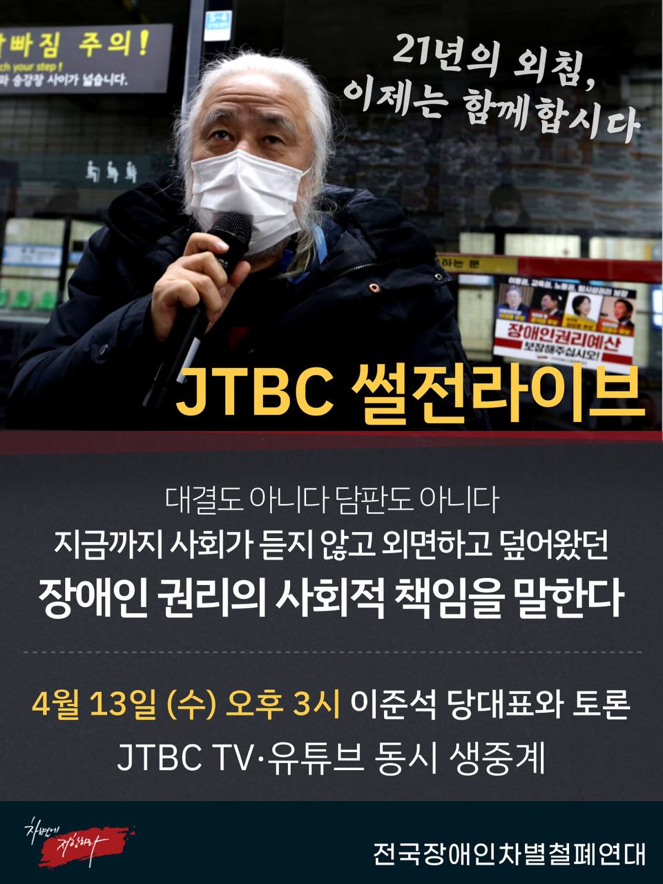 박경석 전국장애인차별철폐연대(아래 전장연) 상임공동대표와 이준석 국민의힘 당대표가 13일 오후 3시 10분 JTBC 썰전에서 만난다.