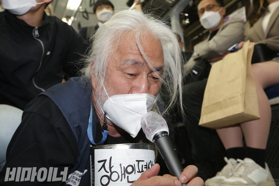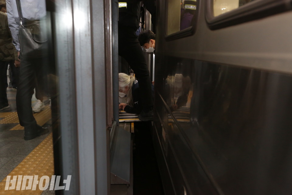 4일 오전 8시 39분, 3호선 경복궁역(안국역 방향)에 들어온 열차 문이 열렸다. 박경석 전국장애인차별철폐연대(아래 전장연) 상임공동대표와 배재현 서울장애인차별철폐연대 대의원은 휠체어에서 내려와 기어서 지하철을 탔다. 열차 문이 닫히고 출발하기까지 6분이 걸렸다. 장애인 활동가들은 지하철 바닥에 엎드린 채 동대입구역까지 이동했다. 그곳은 지난달 16일 한 지체장애인이 승강장과 열차 사이에 다리가 빠져 부상을 당했던 곳이다. 경복궁역에서 동대입구역을 왕복하는 동안 4번의 승하차가 있었고, 총 20분 정도의 시간이 소요됐다.