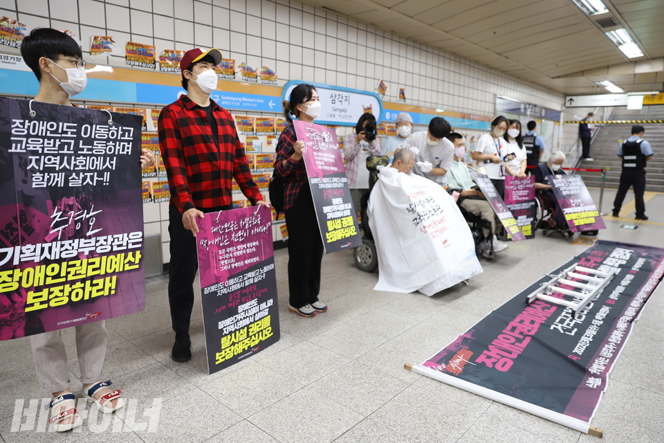 5월 6일부터는 장소를 바꿔 장애인권리예산 보장에 대한 기획재정부 답변을 촉구하며 삭발 투쟁을 이어갑니다. 장소는 윤석열 정부의 집무실이 있는 용산에서 가까운 지하철역 4호선 삼각지역 1-1 승강장(숙대입구역 방향)입니다. 비마이너는 삭발 투쟁을 하는 장애인 활동가들의 투쟁결의문을 싣습니다.