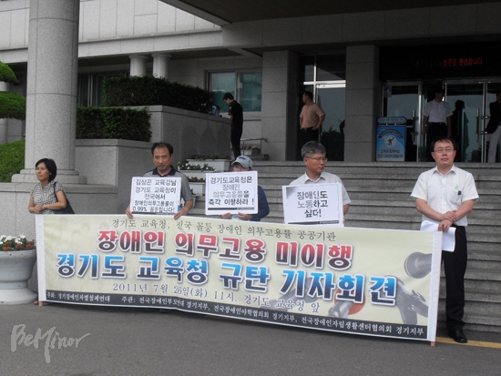 이날 기자회견은 지난 8일 고용노동부가 ‘장애인 고용 실적이 저조한 공공기관 및 기업’ 결과 발표에서 국가 및 지방자치단체 39개 중 경기도교육청이 전국 꼴찌(0.99%)를 차지한 데 따른 것이다.
