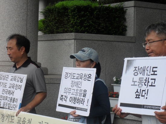 전국장애인부모연대 경기지부 박미영 광명지회장은 굳게 닫힌 교육청을 향해 “경기도교육청은 장애인의무고용제도가 시작된 지 21년이 지났지만, 3%밖에 되지 않는 법적 기준조차 지키지 못하고 있는 원인을 분석하고 이에 대한 대책을 세워야 한다"라면서 "장애학생에 대한 전환 및 직업 교육이 제대로 지원되지 않기에, 장애인이 막상 일하고 싶어도 어디에도 지원할 수 없는 벽을 만들고 있지 않은가?”라고 목소리를 높였다.