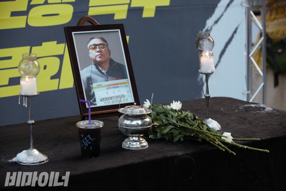 지난 17일 인천시청 앞에서 ‘권오진 열사 4주기 추모제’가 인천장애인차별철폐연대 주최로 열렸습니다. 살아생전 고인과 함께 야학에 다니고, 인천시의 활동지원 24시간 중단을 규탄하며 1인 시위했던 유명자 씨가 고인을 추모하는 글을 낭독했습니다.
