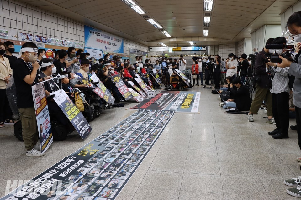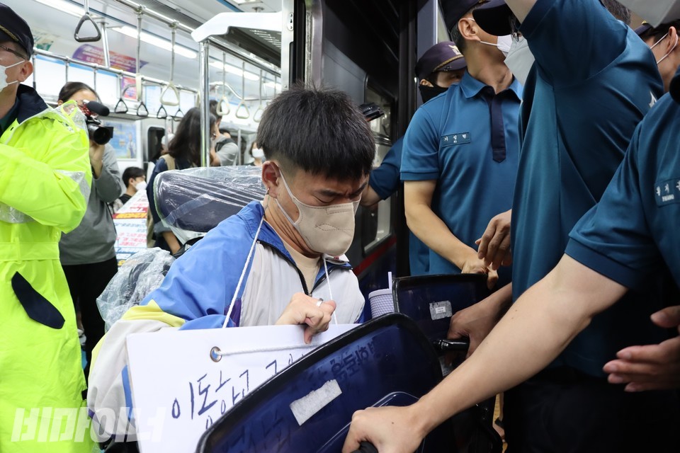 전장연은 기자회견을 끝내고 오전 9시 20분경부터 10시까지 약 40분간 4호선 삼각지역(숙대입구역 방향)에 온 열차를 멈춰 세웠다. 1-1칸부터 끝칸까지 타고 내리기를 반복하며 장애인권리예산 요구를 외면한 윤석열 정부에 항의했다.