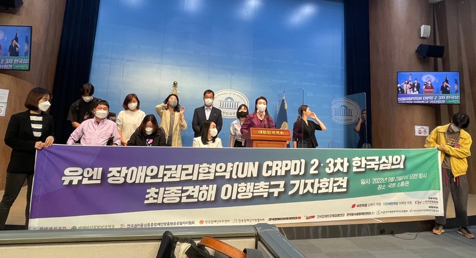 위원회의 정부 2·3차 심의는 지난달 24~25일, 스위스 제네바 유엔 본부에서 열렸다. 1차 최종 견해가 나온 지 8년 만에 열린 이번 심의에서, 정부는 장애인권을 잘 보장하고 있다고 자화자찬을 늘어놔 장애계의 공분을 샀다. 이에 50개 시민사회단체로 구성된 ‘협약 한국 정부 심의 대응 장애계 연대’는 한국 심의가 끝난 직후인 지난달 25일 오후 2시(현지 시각), 유엔 본부에서 기자회견을 열고 정부를 강력하게 규탄한 바 있다.