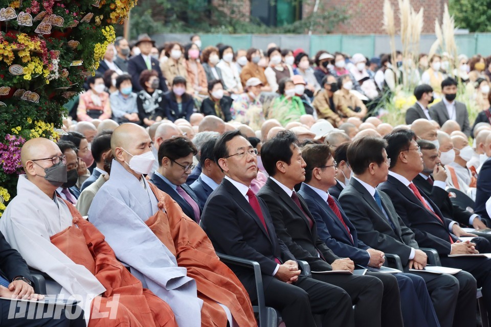 같은 시각, 전장연 활동가들은 피켓을 활짝 펼치고 “주호영 원내대표님, 저희 좀 만나주십시오. 장애인권리예산 보장, 여당인 국민의힘에서 애써주셔야 합니다”라고 외치고 있었다. 내빈의 축사가 모두 끝나고, 권성동 국민의힘 국회의원과 이재명 더불어민주당 대표, 오세훈 서울시장이 연달아 레드카펫을 밟고 대웅전 앞을 빠져나갔지만 주호영 원내대표만 보이지 않았다. 활동가들은 연신 “주호영 원내대표님, 만나주십시오”라고 외쳤다.