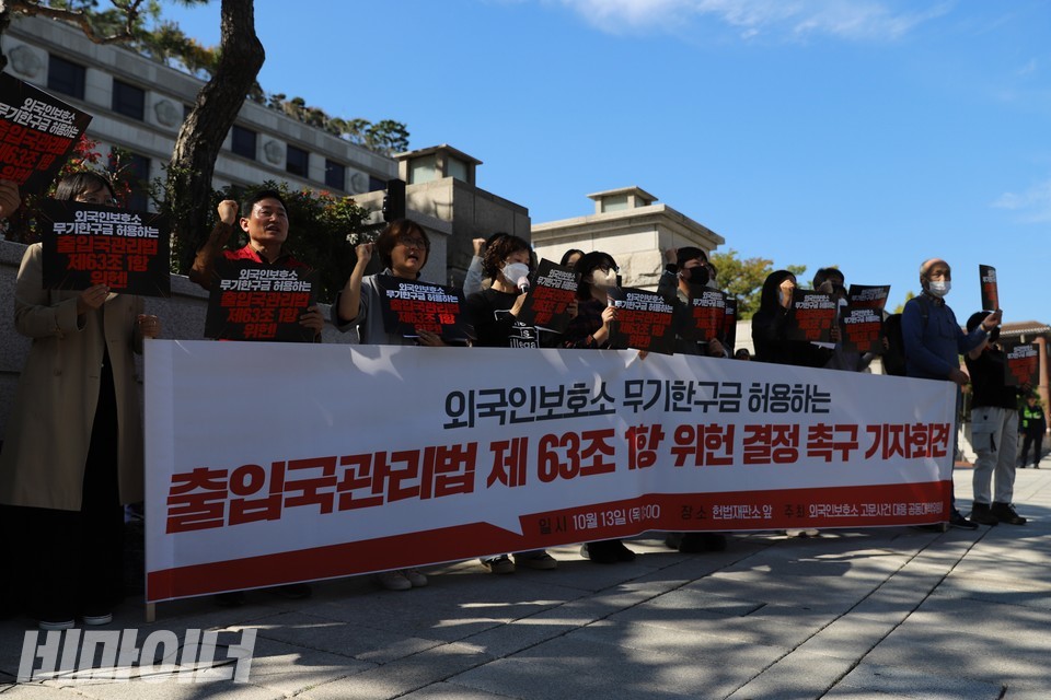 외국인보호소 고문사건 대응 공동대책위원회(아래 공대위)와 난민인권네트워크 관계자들은 이날 헌법재판소 앞에서 오후 1시부터 40분가량 기자회견을 열었다. 외국인보호소에 수용된 외국인을 무기한 구금할 수 있도록 하는 출입국관리법 제63조 제1항의 위헌 결정을 헌법재판소에 촉구하기 위해서다.