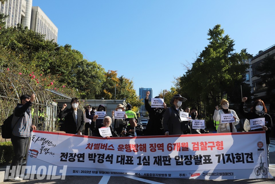 18일 오전 9시 30분, 서울 서초구 서울중앙지방법원 앞 법원 삼거리에서는 이날 10시에 있을 박 대표의 1심 선고에 앞서 입장을 발표하는 기자회견이 전장연 주최로 열렸다.