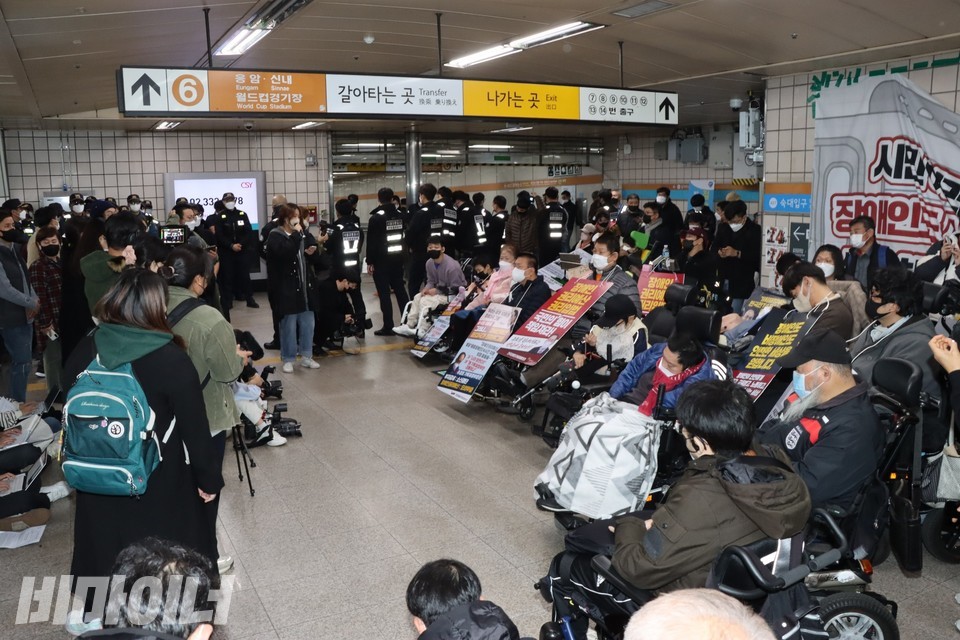 고성과 충돌은 20분 넘게 이어졌다. 활동가들은 서울교통공사와 협상한 결과, 삼각지역 승강장이 아닌 지하 1층 개찰구 앞에 농성장을 설치하는 데 합의했다. 모두 같은 날 불과 90분 안에 벌어진 일이다.
