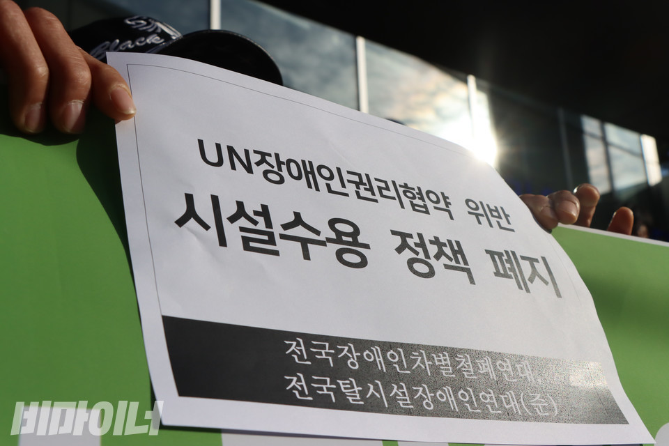 ‘모든 장애인은 시설이 아니라 지역사회에서 다른 사람들과 동등하게 살아가야 한다. 정신병원, 특수기숙학교, 재활센터, 그룹홈 같이 ‘돌봄’이나 ‘치료’를 이유로 장애인을 특정 시설에 가둬서는 안 된다. 시설은 그 자체로 폭력이자 인권침해다.’