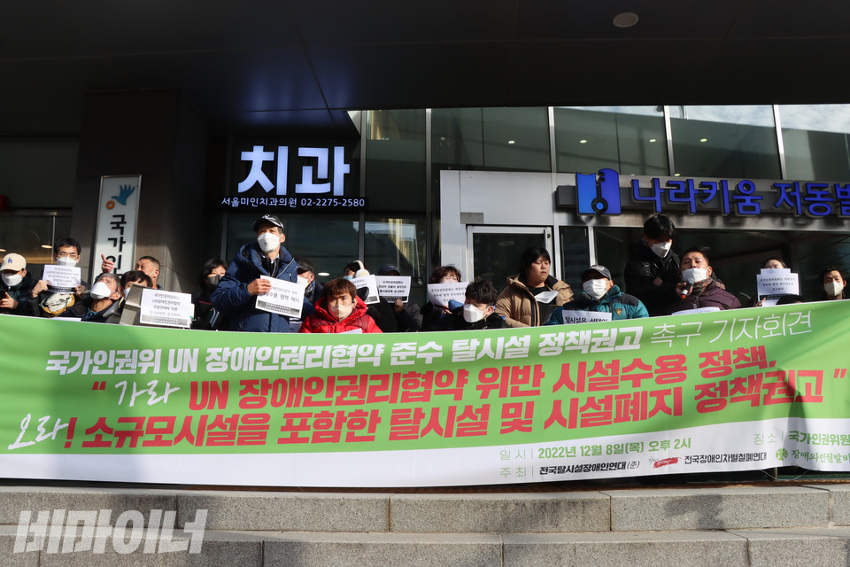 이날 장애계는 협약을 비롯해 유엔이 한국 정부에 권고한 제2·3차 병합보고서 최종견해, 탈시설 가이드라인 등에 기반한 탈시설 정책을 인권위가 정부에 강하게 권고할 것을 촉구했다.