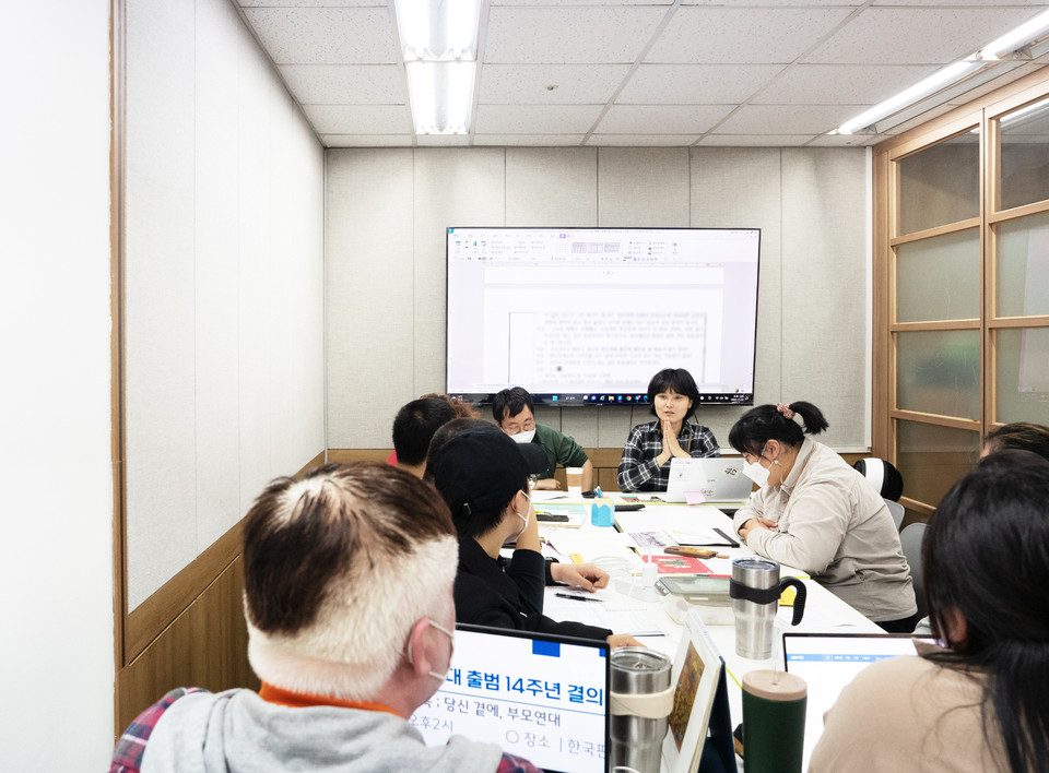 대체 어떻게 일하는 게 평등한 걸까요. 잘 모르는 시간을 길게 보냈어요. 정보를 똑같이 나누고 모든 일을 n분의 1로 나누는 게 평등한 건 아닌 거 같았어요. 그래서 2019년엔 비장애인들의 실무회의와 발달장애인 당사자 활동을 중심으로 한 전체회의를 별도로 운영하게 된 거예요. 그런데 문제가 생겼어요. 당사자 활동가들의 성장을 고려하지 못한 거예요. 정보 비대칭이 점차 심해졌고, 조직운영을 위해 급하게 결정을 내릴 때 발달장애인 동료들을 제대로 설득하거나 그들에게 설명하지 못하는 일이 늘었어요. 비장애인들만 알고 발달장애인은 모르는 내용들이 생겼어요.