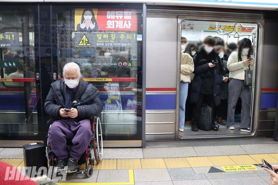 전장연은 올해 1월 2일, 48차 ‘출근길 지하철 탑니다’를 하려고 했으나 서울교통공사·서울시의 ‘무정차’ 대응으로 지하철에 탑승하지 못했습니다. 장애인 권리를 무정차하는 정부를 규탄하며 전장연은 매일 아침 8시, 혜화역 승강장에서 시민들에게 권리예산과 입법을 알리는 선전전을 합니다. 비마이너는 꾸준한 매일의 투쟁을 꾸준하게 기록하고자 합니다. 같으면서도 다른 어제와 오늘을 사진과 글로 전합니다.