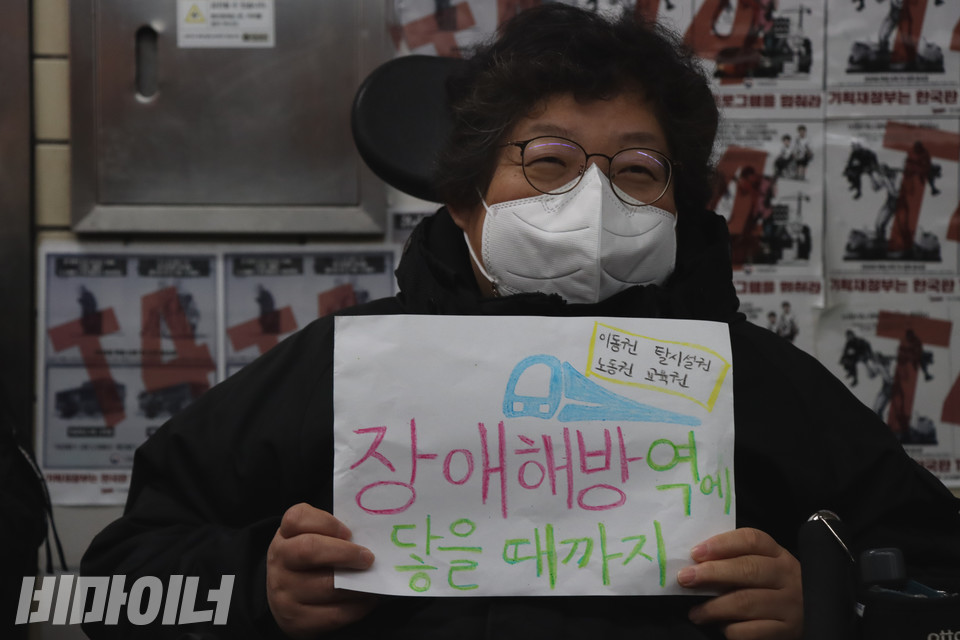 전국장애인차별철폐연대(아래 전장연) 활동가들은 2021년 12월 6일부터 혜화역 승강장 5-4(동대문역사문화공원역 방면)에서 장애인권리예산·입법 쟁취를 위한 선전전을 하고 있습니다. 전장연은 지난해 47차례 ‘출근길 지하철 탑니다’를 진행하고, 141일 동안(3월 30일~12월 1일) 177명의 장애인·비장애인 활동가들이 삭발 투쟁을 했습니다. 그러나 올해 장애인권리예산은 정부 예산안에 반영된 자연증가분을 제외하면, 국회에서는 고작 1.1%만 증액됐습니다. 기획재정부가 예산 증액에 반대했기 때문입니다.